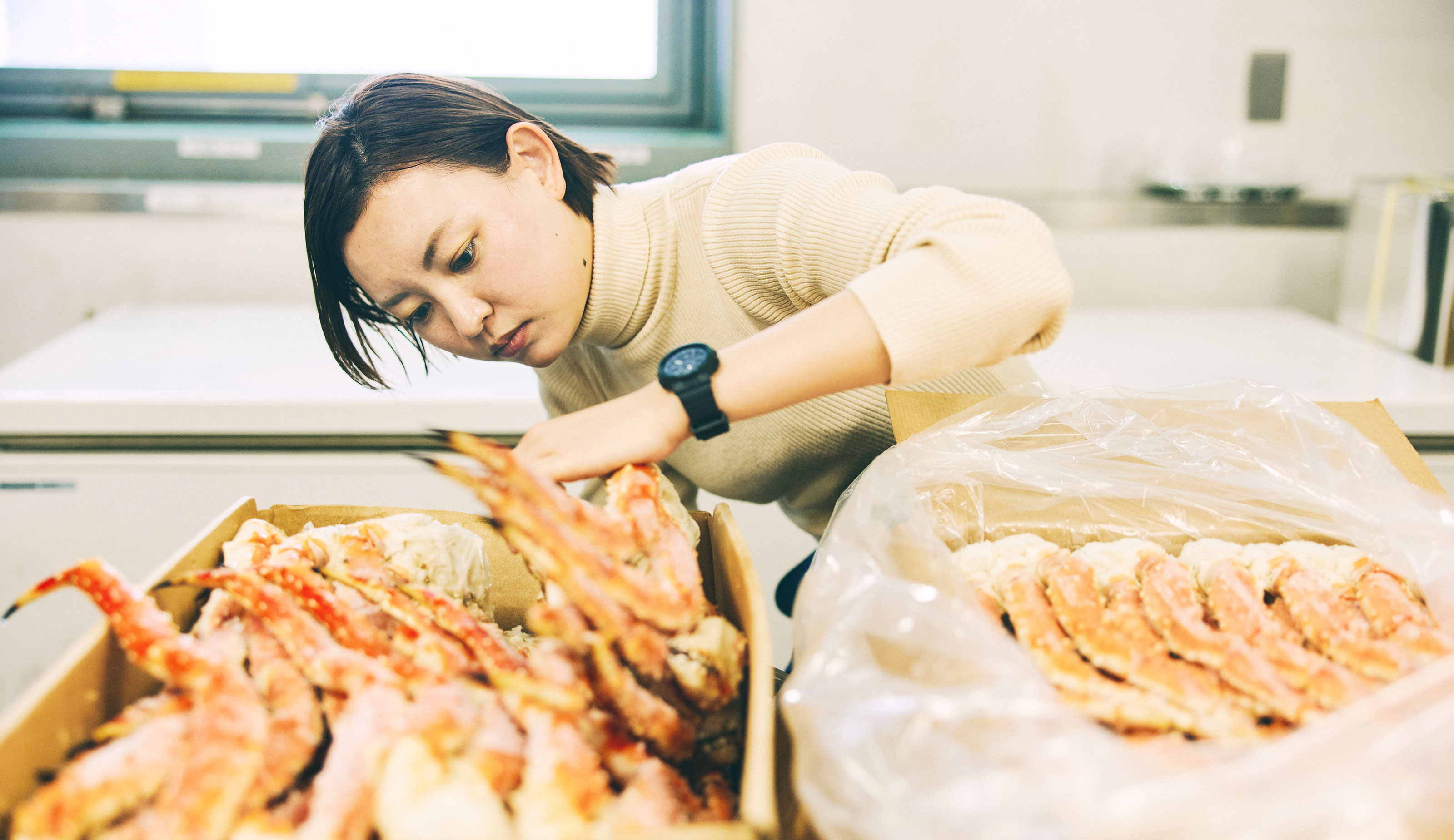 タラバガニの買い付け数量が業界トップクラスという当社の強みを活かして、味や身入りの良い厳選したカニだけをシュリンク包装(製品の形に沿うようにフィルムを熱収縮させた包装形態)した製品です。鮮度が良いことはもちろん、国内随一の加工技術を持った工場で加工しているため、見た目が良いところも魅力です!